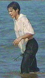 Jeans kommen immer gut, und in diesem Video gibt es eine tolle, lange Szene. Das Mädchen trägt Blue Jeans, gehalten von einem engen, schwarzen Gürtel, ein zu kurzes, weißes T-Shirt über BH und Höschen. Sie rennt ein paar Mal ins Wasser hinein und wieder heraus, bis ihre Jeans naßgespritzt sind. Dann läßt sie sich rückwärts fallen, macht damit ihre Haare naß und spielt weiter im Wasser.