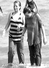 Strumpfhosen wurden gewünscht und hier kommen ein paar gute Szenen. Rebecca's Handstände im Wasser in ihrem schwarzen Rock und ihrer Bluse erlauben einige beeindruckende Blicke auf ihre schwarzen Strümpfe. Nachgefragt, ob sie und ihre Freundin bereit wären, in ein paar gestellten Wetlook-Szenen mitzumachen, willigten beide begeistert ein (demnächst in Videos zu bewundern). Rebecca liebt das Wasser und erzählt, daß sie niemals einen Badeanzug trägt. Sogar zu Hause im Pool schwimmt sie in BH und Unterhose unter Shorts und T-Shirt.