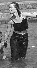 Jeans kommen immer gut, und in diesem Video gibt es eine tolle, lange Szene. Das Mädchen trägt Blue Jeans, gehalten von einem engen, schwarzen Gürtel, ein zu kurzes, weißes T-Shirt über BH und Höschen. Sie rennt ein paar Mal ins Wasser hinein und wieder heraus, bis ihre Jeans naßgespritzt sind. Dann läßt sie sich rückwärts fallen, macht damit ihre Haare naß und spielt weiter im Wasser.